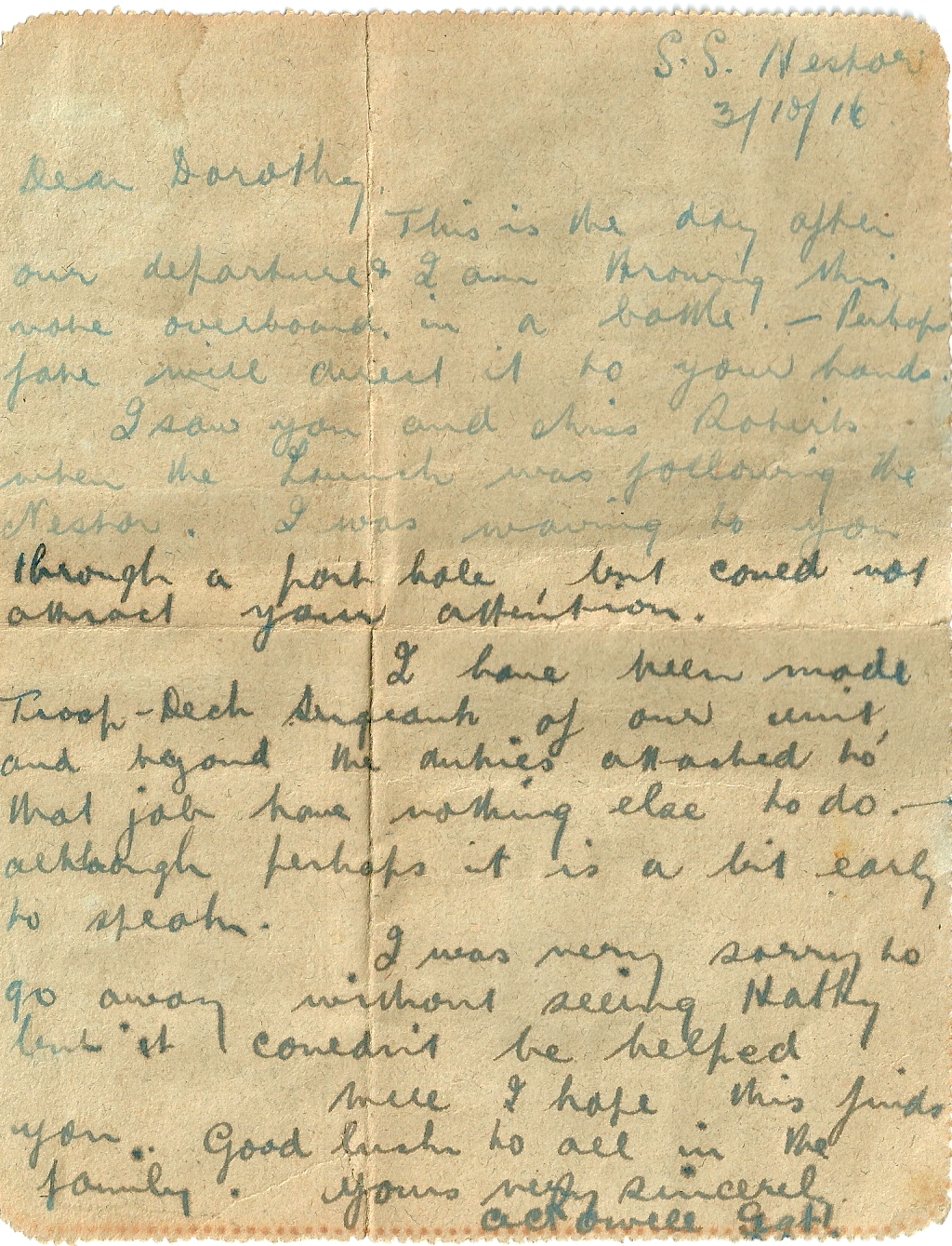 Way back in 1916 a young man joined the Australian Army to go off to fight in WWI. He set sail for the war with his battalion from Melbourne and as he sailed away from those Australian shores he quickly wrote a short note on a government issued letter card to a girl he knew (we don't know if she was a girlfriend or just a friend).